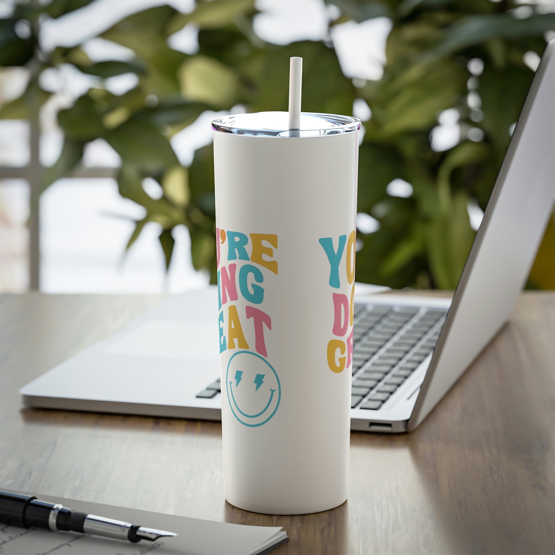 Rainbow "You're Doing Great" Tumbler with Straw and Smiley Face - 20 oz Capacity ; Positive Vibes Tumbler,Skinny Steel Tumbler with Straw, 20oz,mental health cup with straw